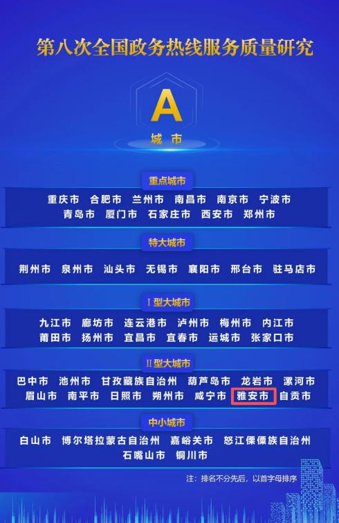 1月30日,中山大学数字研究治理中心发布《第八次全国政务热线服务质量研究报告》,雅安市12345政务服务便民热线获评全国政务热线服务质量A等级。